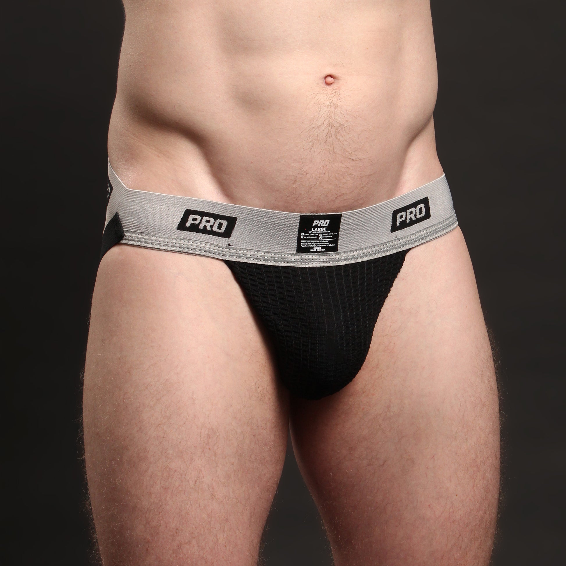 The elastics are cut so the repeating PRO logos are evenly spaced, centered and never cut off by a logo or seam. Wouldn't be much of a pro jock otherwise, would it?
